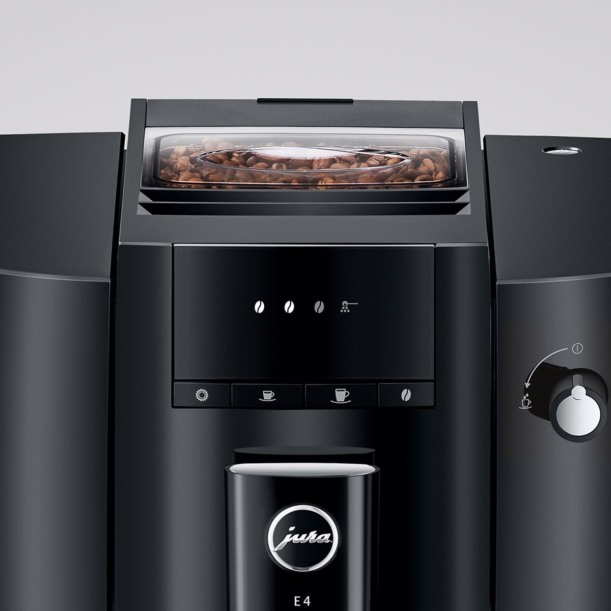 E4 má charakteristický design automatických kávovarů značky JURA. Vyznačuje se jasně vymezenými plochami a ostře vedenými liniemi. Úsporný tvarový výraz a zpracování s nejvyšší možnou precizností podtrhují prvotřídní kvalitu tohoto automatického kávovaru. Purismus se projevuje také ve výběru barev. Zatímco celý korpus je v decentní barvě Piano Black, chromované prvky udávají akcenty a jsou příslibem dokonalého výsledku kávy.