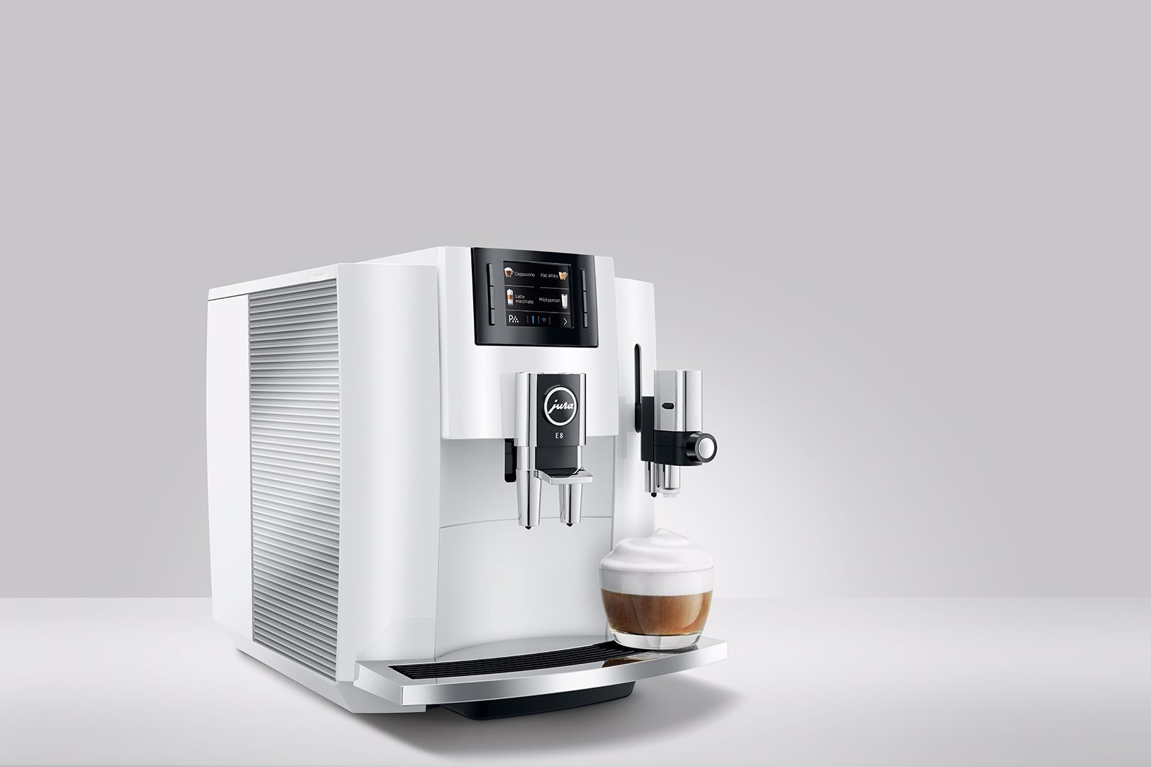 Nejúspěšnější kávovar od značky JURA byl dále zdokonalován. Celkem dvanáct různých specialit připravíte s modelem E8 jediným stisknutím tlačítka. Novým přírůstkem do nabídky nápojů je espresso macchiato, espresso doppio, káva speciál a horká voda pro zelený čaj, vše připravované jediným stisknutím tlačítka.
